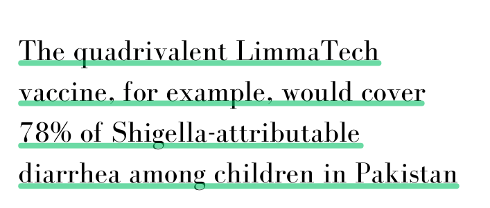 More importantly, the AKU team will be looking at how much it is costing families and health care systems to handle children with Shigella. Vaccines would be key to reducing the burden of disease and the cost on healthcare systems. The quadrivalent LimmaTech vaccine, for example, would cover 78% of Shigella-attributable diarrhea among children in Pakistan.
